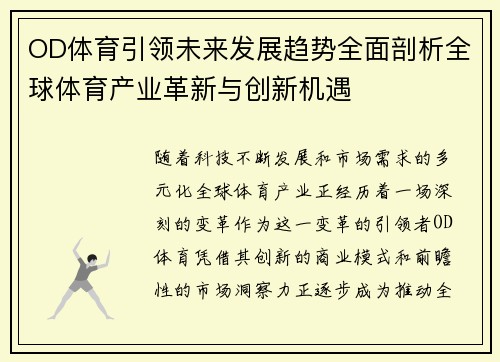 综上所述,OD体育凭借其在科技创新、内容创作、体育文化建设以及全球化布局等方面的领先优势,正在逐步引领全球体育产业的发展趋势。其数字化转型与科技创新的融合为产业带来了新的发展动力,而内容创作和媒体合作的创新则使得体育内容传播更加多元化。与此同时,OD体育通过深度挖掘体育文化与社群建设,增强了品牌的忠诚度和影响力。在全球化布局方面,OD体育通过战略性拓展新兴市场,为其未来的可持续发展提供了强大的支撑。